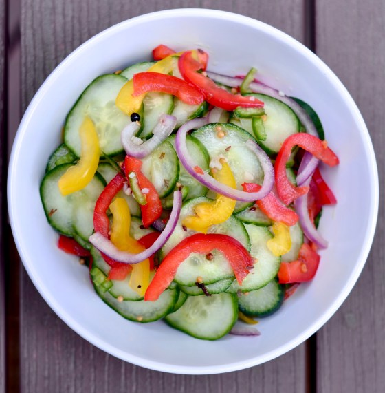 In the summer when cucumbers are bountiful try this recipe for quick pickles. I used English cucumbers because they don’t have as many seeds as other cucumber varieties but feel free to use whatever type of cucumber you like. These pickles are not very sweet. If you like sweet pickles see the tip below.