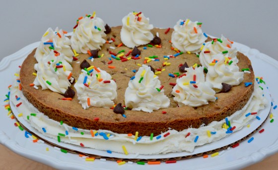 Chocolate Chip Cookie Cake with Vanilla Buttercream Icing Swirls