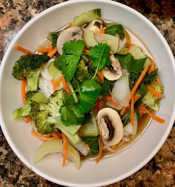 To serve: Divide vegetables and broth evenly between noodle bowls. Garnish with cilantro and peanuts. Place soy sauce and Sriracha on kitchen table to customize soup’s flavor. (Soy sauce to increase soup’s saltiness and Sriracha to increase soup’s spiciness.) Makes 4 servings. Enjoy!