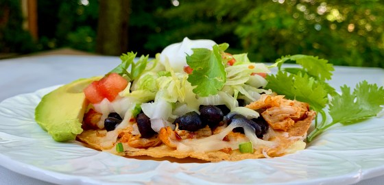 Black Bean and Chicken Tostadas use dried beans cooked in an Instant Pot. The flavor is pretty amazing (you can substitute canned beans if you like). For ease, chicken is seasoned with a pre-seasoned mix of spices from Mrs Dash. Broiling the onions and fresh jalapeño peppers warms them up just a little bit and takes away their “raw” taste. The garnishes are fresh and add great flavor.