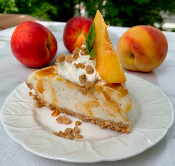 Peach Ice Cream Pie with Caramel Drizzle and Crunchy Toffee Bits
