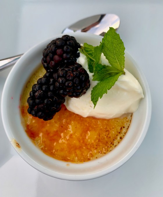Jayne doesn’t use the oven’s broiler to caramelize the sugar. She says it heats up the custard and causes it to cook more and not be creamy. Instead she uses a butane welding torch. She doesn’t like the small hand held torches because they won’t caramelize many ramekins! Remove ramekins from refrigerator and place on a rimmed metal sheet pan. Remove any moisture on top of custard with a paper towel. Sprinkle each ramekin with 1 teaspoon granulated sugar. Turn on torch. As you caramelize the sugar, keep torch in constant motion to prevent burned spots. The sugar will turn into a brittle glaze of melted sugar that cracks when hit with a spoon. Run to the table and enjoy a fabulous dessert! Makes 8 Creme Brûlée’s