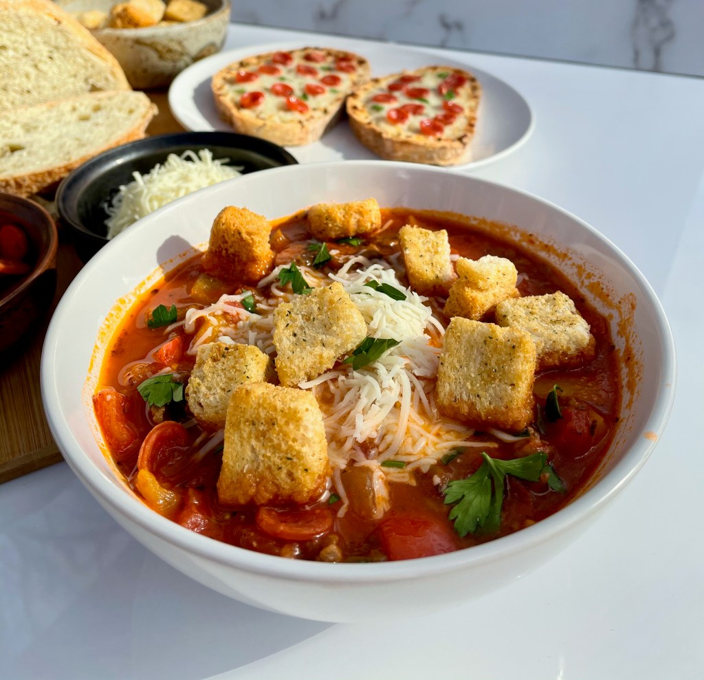 Supreme Pizza Soup with Pepperoni Cheese Toast