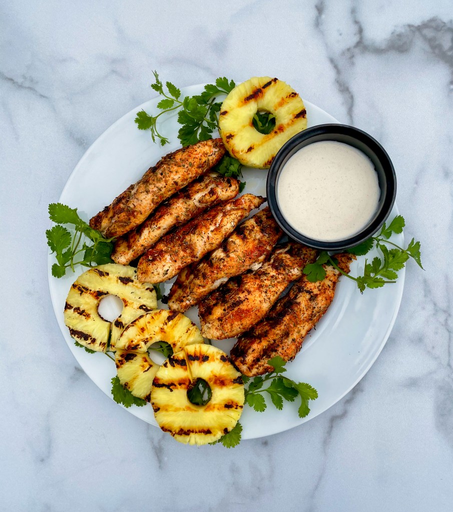 Dry Rubbed Grilled Chicken Sandwiches with Alabama White Sauce and Grilled Pineapple