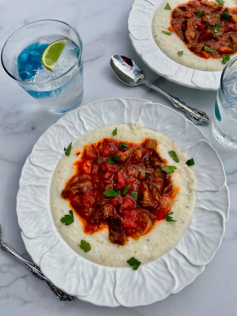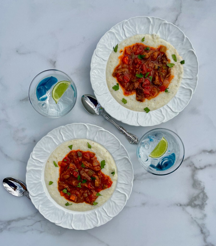 Add tomatoes, beef broth, tomato paste, 1 tablespoon creole seasoning, Italian seasoning, bay leaves, red wine vinegar, and Worcestershire sauce to slow cooker. Stir to combine. Cover with lid. Set timer for 4 hours on high heat. Serve over a bed of creamy grits (Recipe below). Garnish with parsley, freshly ground black pepper and hot sauce. Tip: For a spicier version of this dish add an additional 1/2 tablespoon creole seasoning to flour. Makes 6-8 servings.