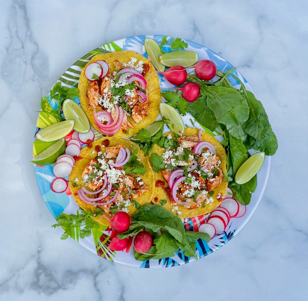 Remove from oven, remove lid, then shred chicken with two forks. Spoon onto tostada shells and garnish with quick pickled red onion (recipe below), fresh cilantro, lime wedges, radishes, and crumbled cotija cheese.