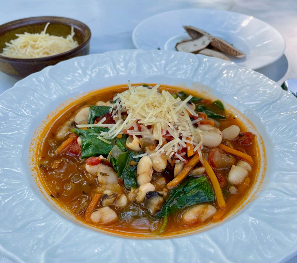 Add tomatoes, bay leaf, thyme, basil, kosher salt, pepper, and vegetable stock. Bring to a boil then reduce heat to a simmer. Cover pot and simmer 15 minutes or until carrots are tender. Add cannellini beans, cover and cook 3 minutes. Add spinach, cover and cook 2 minutes or until spinach wilts. Garnish with shredded Parmesan cheese. Makes 8 servings.