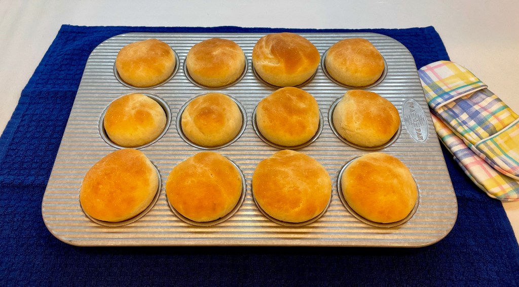 Remove dough from microwave and press dough down. Spray a 12-muffin cup pan with non-stick canola oil spray. Tear off pieces of dough that will fill the muffin cup halfway full. With your hands, roll dough in balls and place in muffin cups. Cover with a kitchen towel and let rise until doubled, about 15 minutes. ( Note: if you have granite or stone countertops place a towel under and on top of muffin pan. Granite makes the pan cold and the rolls won’t rise.)