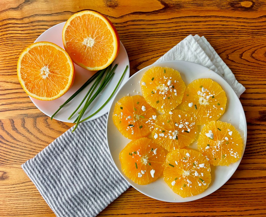 This fresh orange salad has a delicious ginger twist. Bright orange slices are flavored with green chives, a sprinkle of goat cheese, and a mild ginger dressing. In the winter, there is nothing better than the taste and smell of fresh navel oranges!
