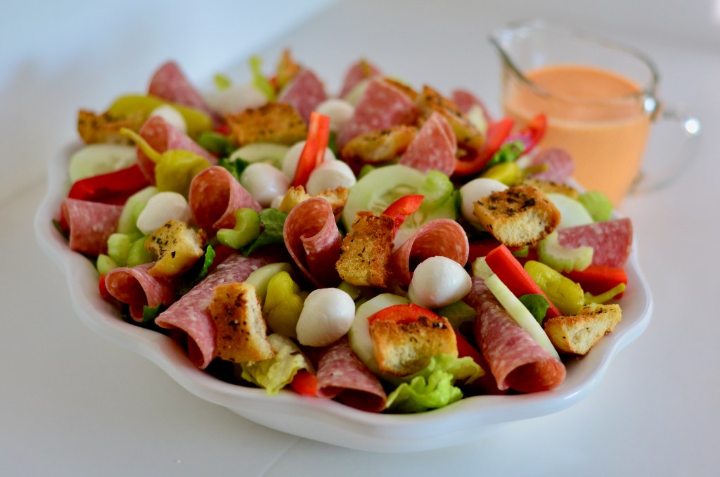 Arrange salad ingredients in a large bowl and serve with Italian dressing on the side. Makes 4 servings.