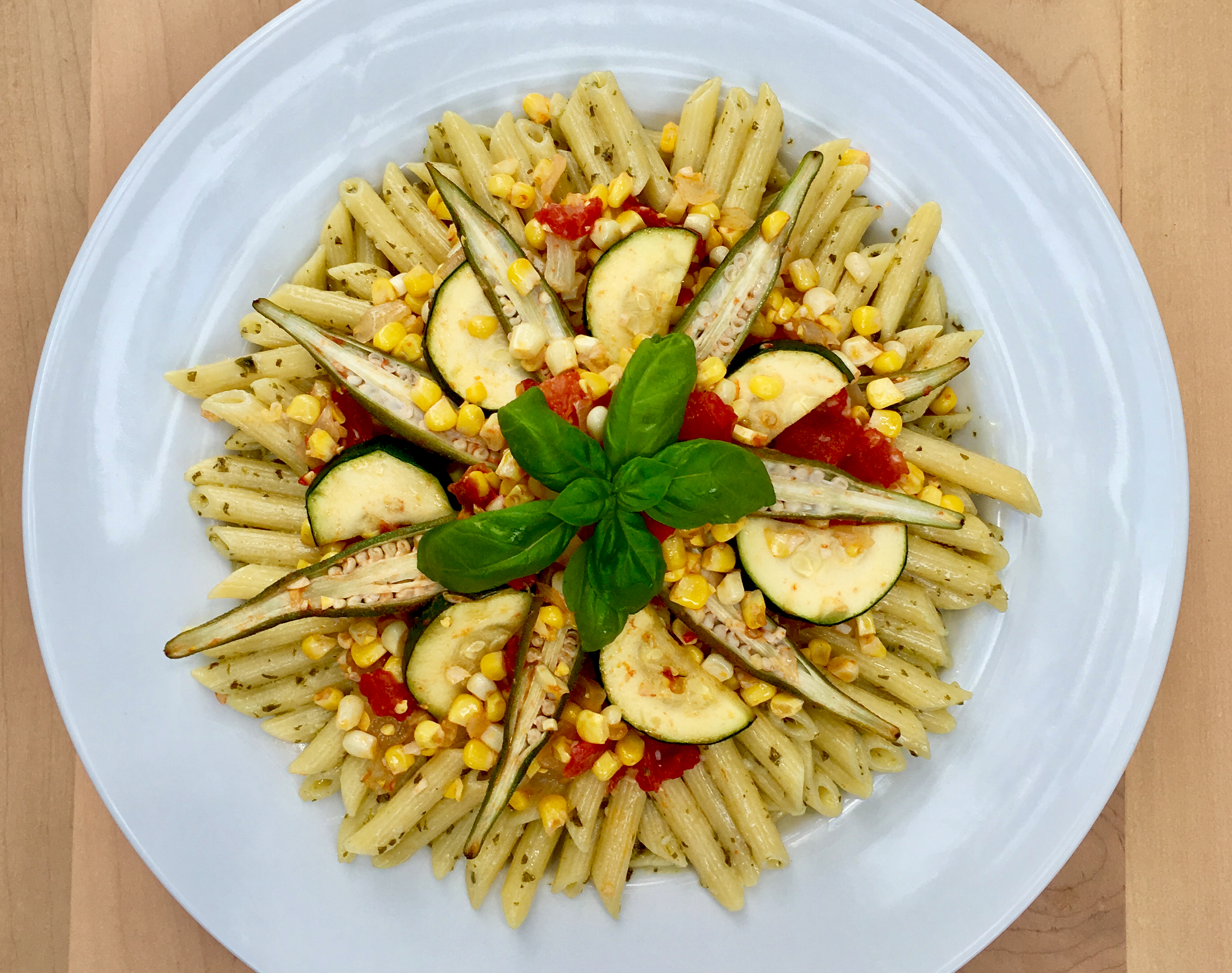 Okra, Corn, Tomato and Zucchini Succotash with Basil Lime Buttered Noodles