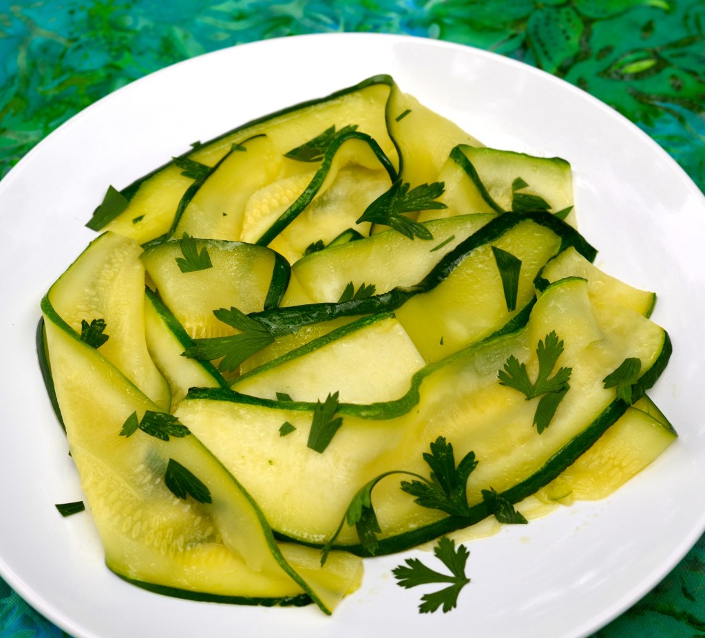 If zucchini is, as my Dad would say, “Coming out your ears” and you are looking for a new idea here is a recipe where zucchini is sliced into ribbons. The zucchini can be enjoyed as a vegetarian side dish or used in place of pasta for Italian dishes. This recipe is simple and uses the freshest ingredients.