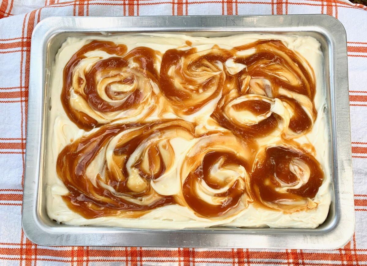 Caramel poke cake with cream cheese swirl icing Published October 11, 2019 at 4032 × 2927 in Caramel Poke Cake with Cream Cheese Caramel Swirl Icing
