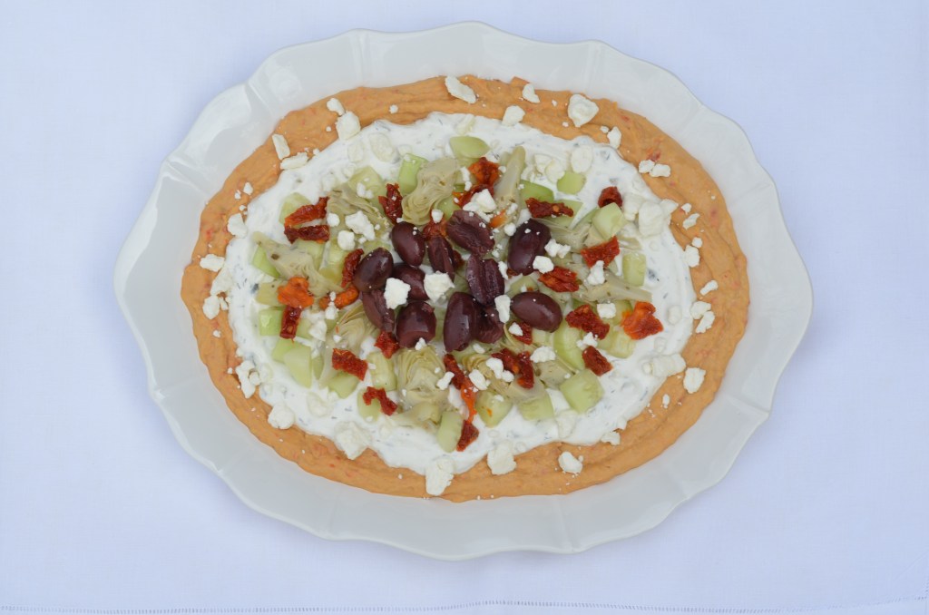 I don’t know about you but I’m tired of Mexican dip. I wanted to develop a new dip recipe that would be cold and colorful for summer. The majority of the ingredients in this recipe are already prepared so all you have to do is layer them. I included a recipe for tzatziki sauce in case you can’t find it at your grocery store.